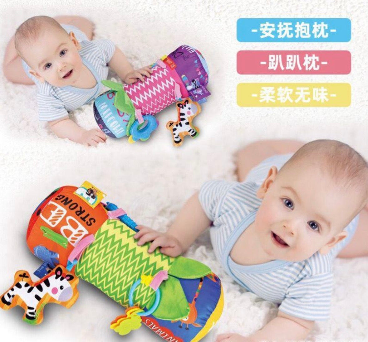 ¡Prepárate para rodar y morder! Este rodillo sensorial viene cargado de mordedores de silicona, libres de BPA y listos para la aventura del gateo. ¡Es como una fiesta de colores y música para tus pequeños exploradores!